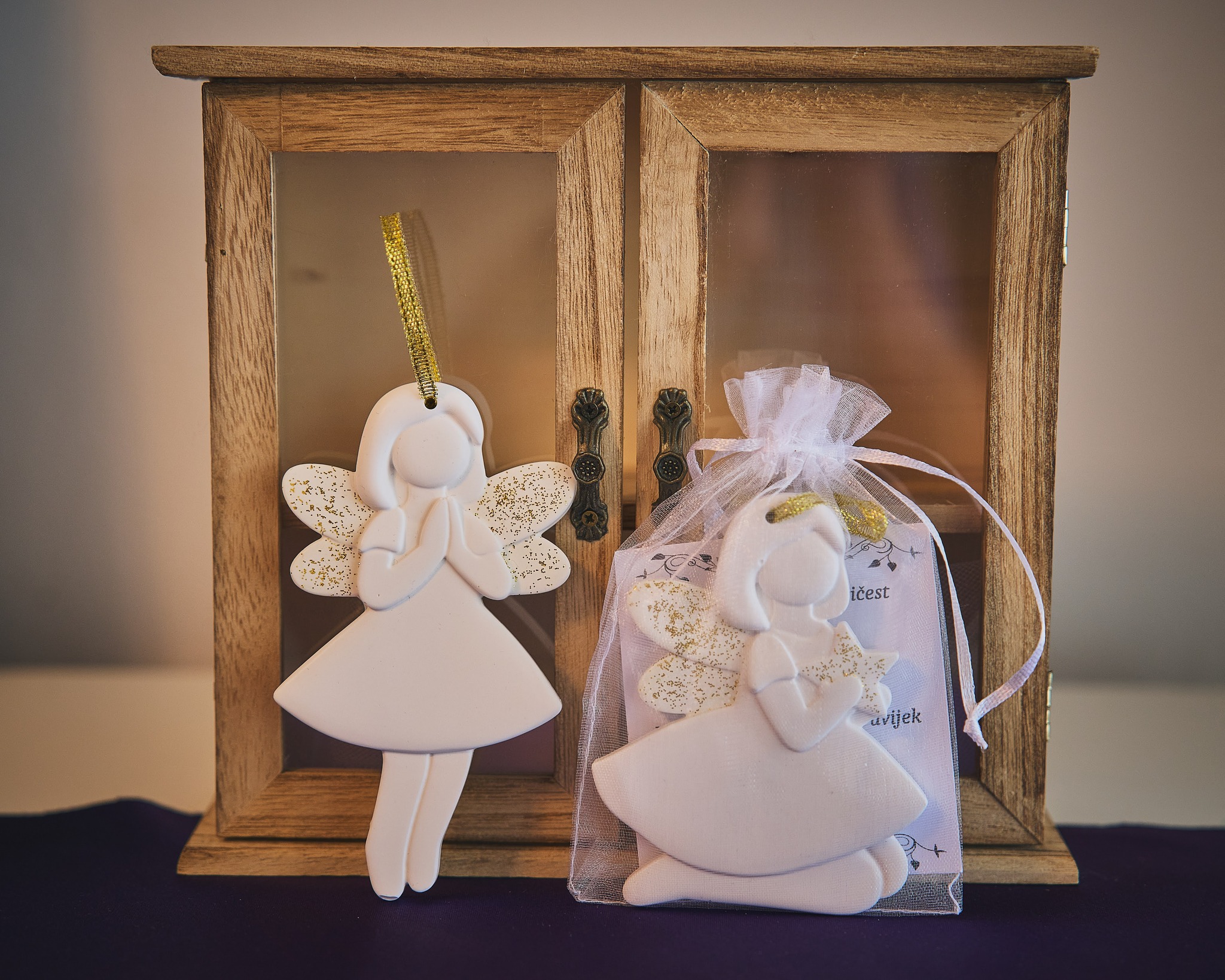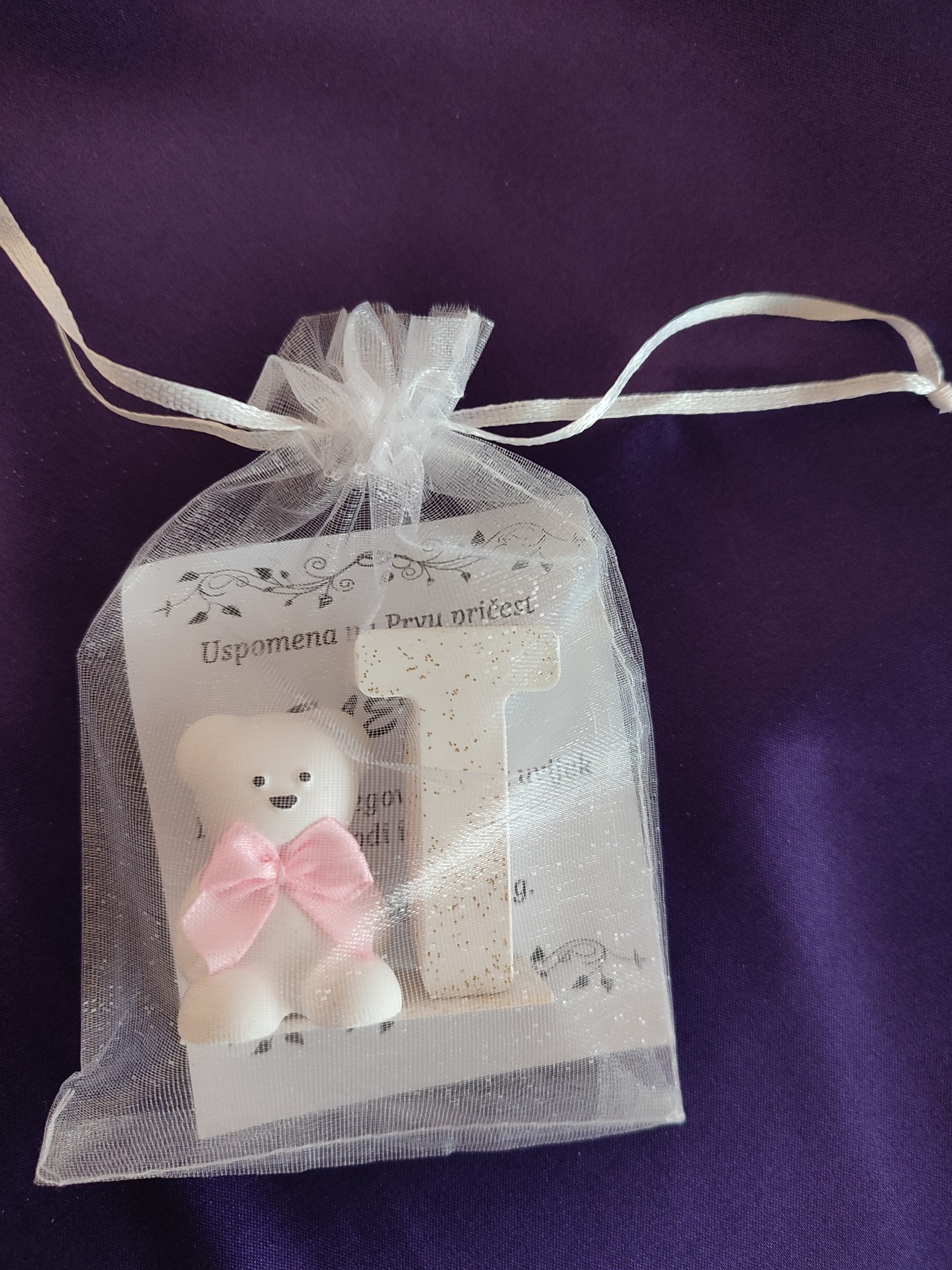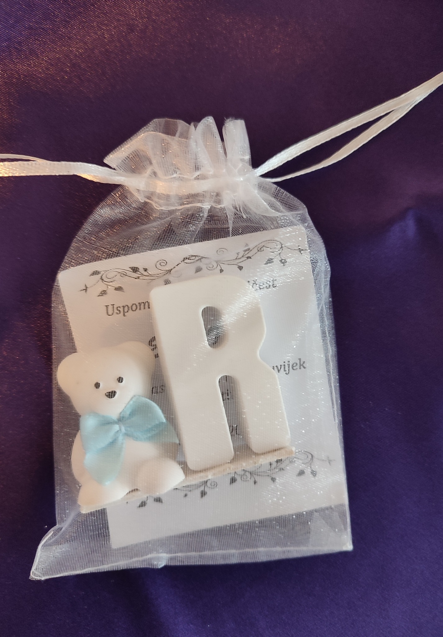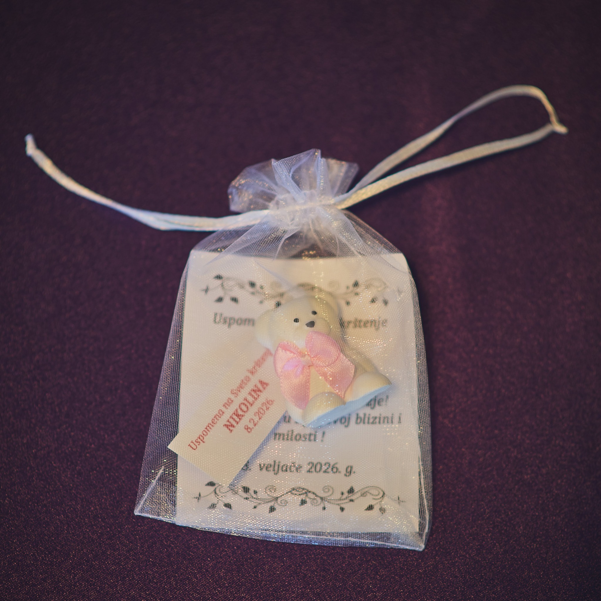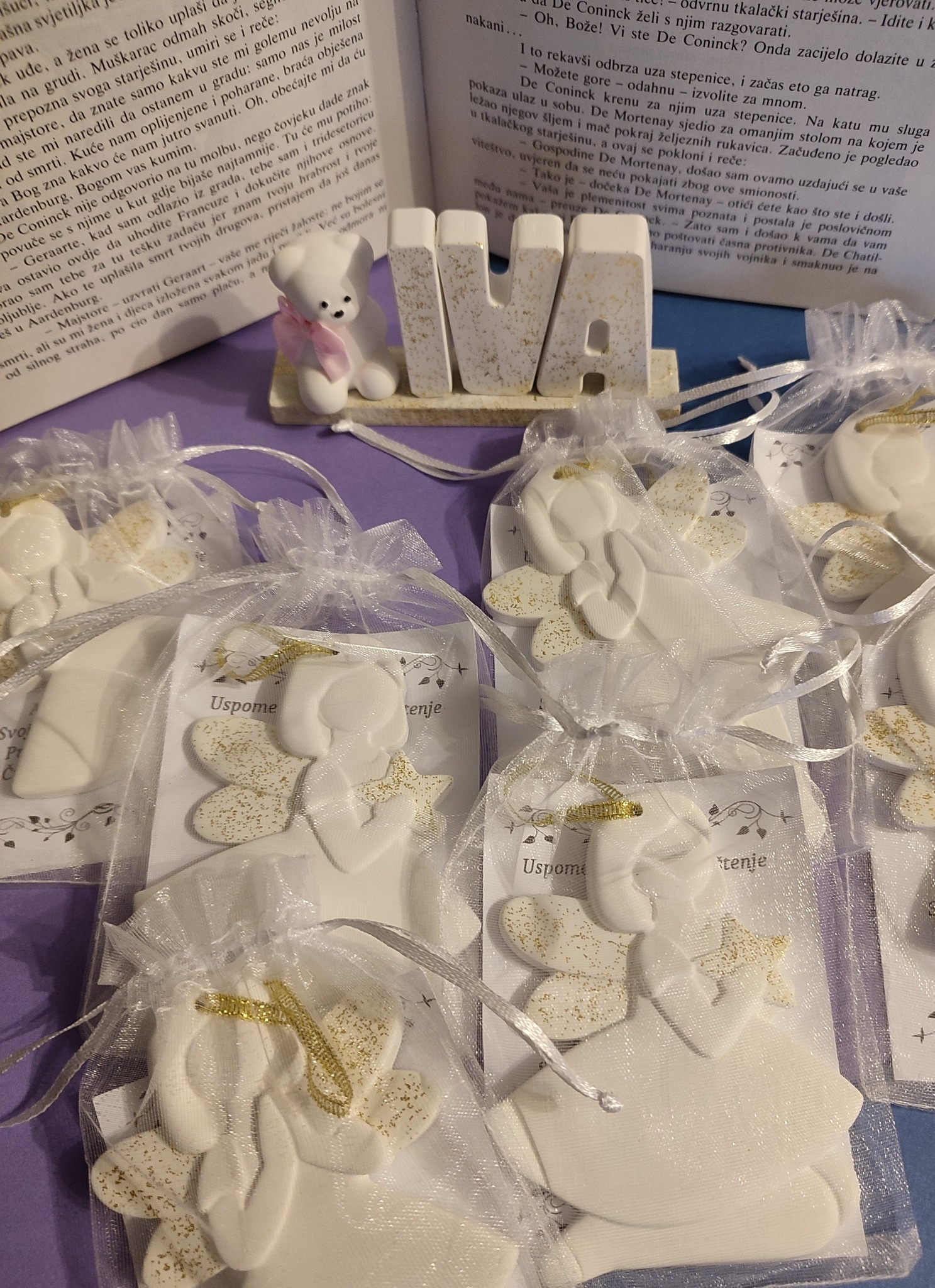 Male uspomene izrađene su od gipsa s efektom keramike, koji stvara dojam čistoće i elegantnog sjaja. Mineralni prah koji koristimo odlikuje se čvrstoćom i otpornošću, dok svaka zahvalnica dolazi u nježnoj ukrasnoj vrećici s posvetom.