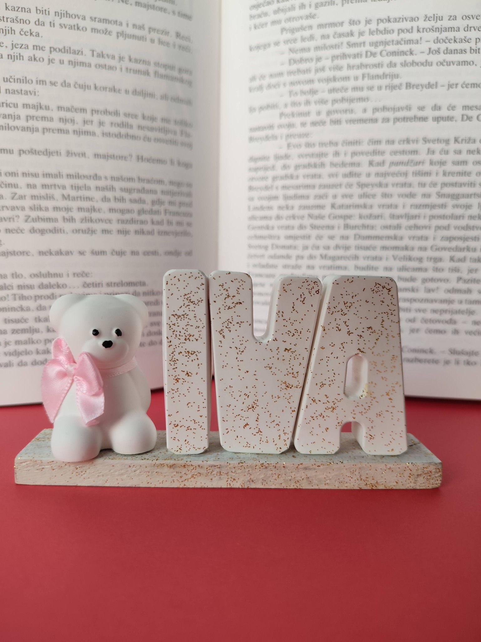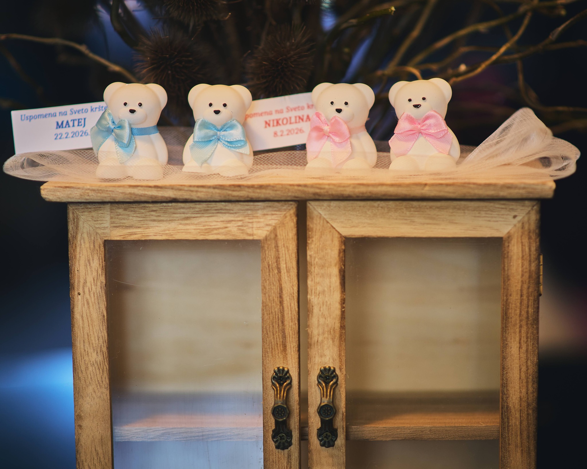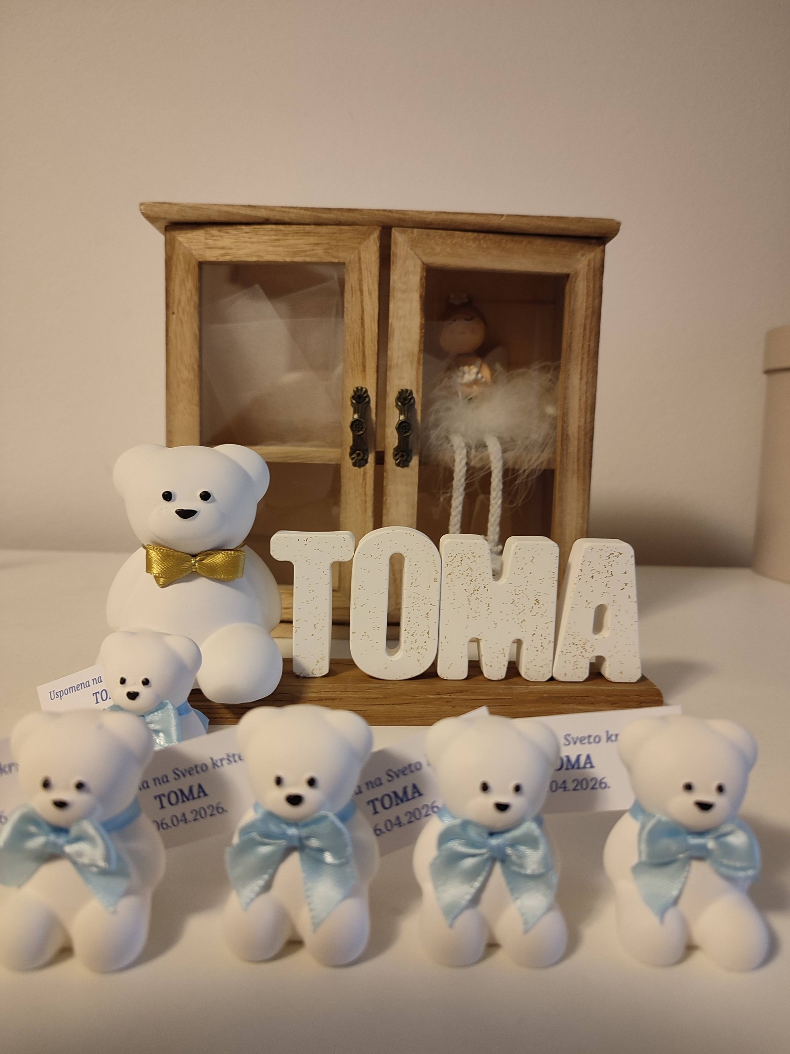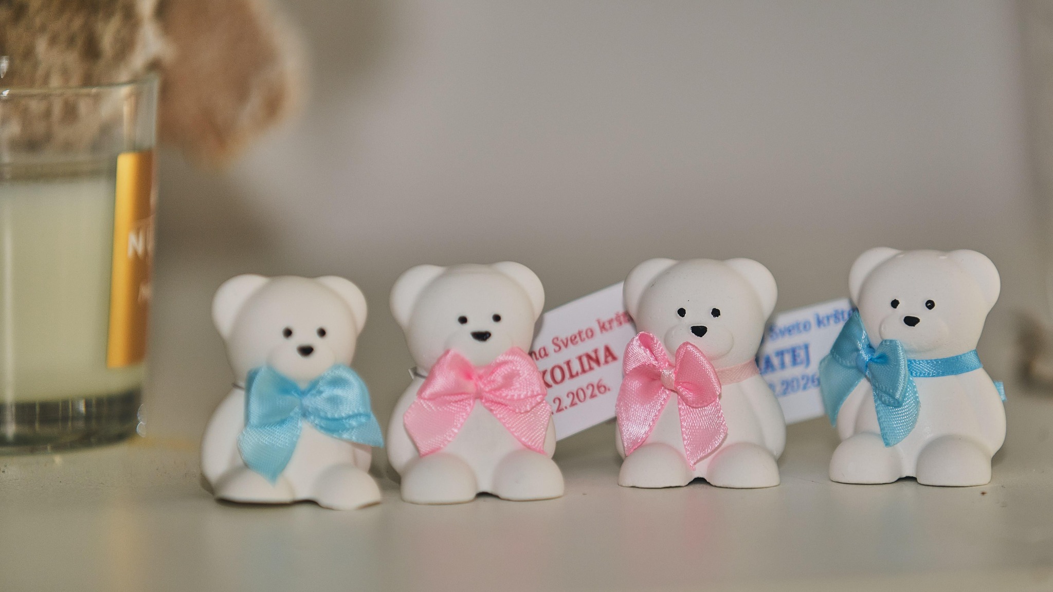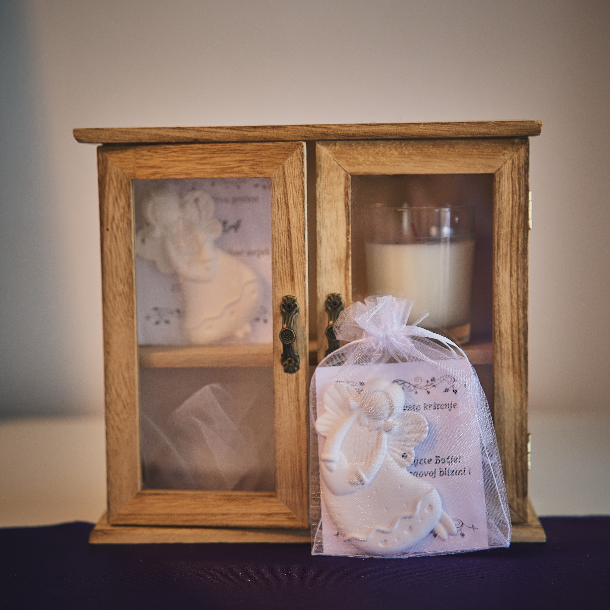 Male uspomene izrađene su od gipsa s efektom keramike, koji stvara dojam čistoće i elegantnog sjaja. Mineralni prah koji koristimo odlikuje se čvrstoćom i otpornošću, dok svaka zahvalnica dolazi u nježnoj ukrasnoj vrećici s posvetom.